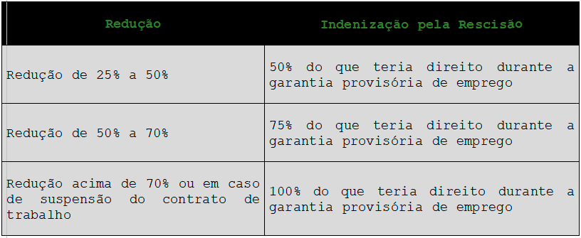 Em caso de rescisão durante o período de garantia provisória de emprego, o empregado fará jus a uma indenização, conforme a seguir: